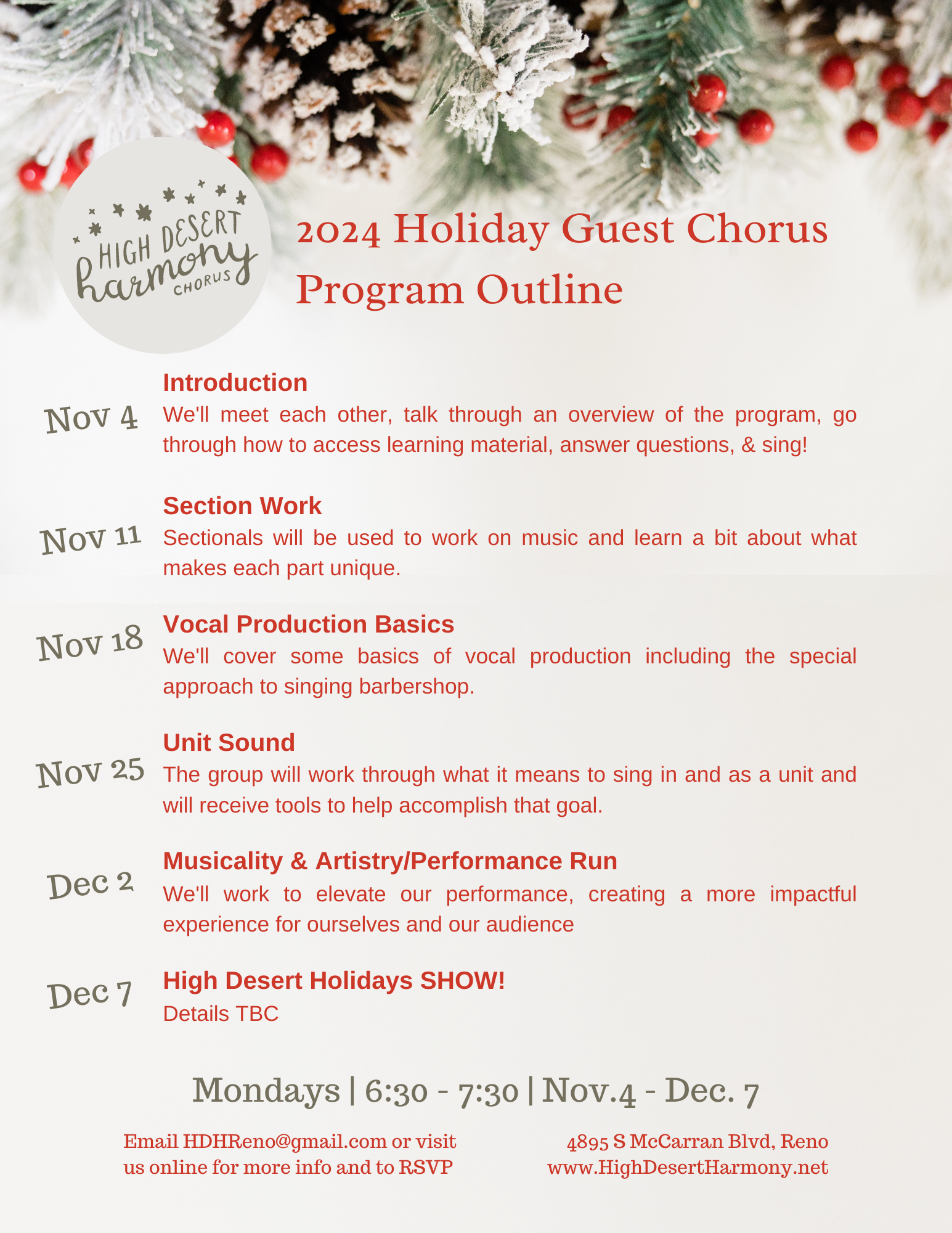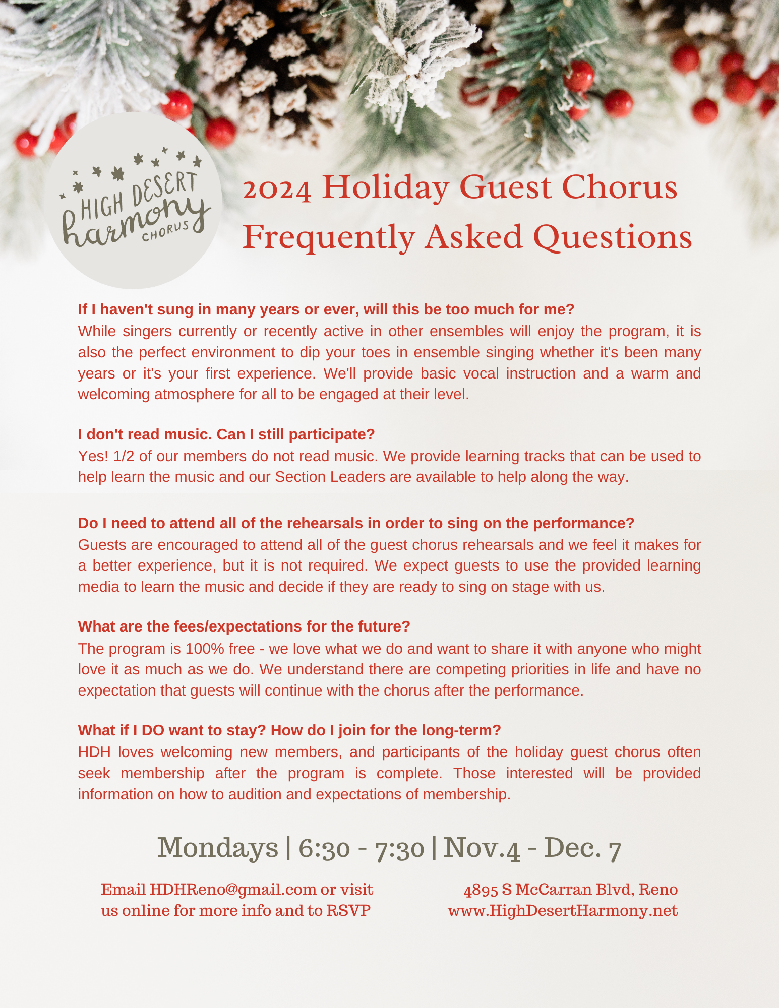 We'd love for you to stay! - We welcome new members year-round and the next big event is our Spring Regional Competition (in Reno) at the beginning of March which is SO MUCH FUN! To audition, just record yourself singing any of the 3 guest chorus songs and send that recording to Amy (HDHReno@gmail.com, text to 775-240-0507, or upload to the member homepage of the website under "My Assessments"). 5 or fewer note errors is a pass! We don't listen for vocal skills or musicality for the audition; just accuracy and the ability to use the learning material to learn the music. More details about membership can be found here. After the Holiday Show, we'll be back at rehearsal on January 5th. Beginning in January, our audition song will change to one of the two competition songs.